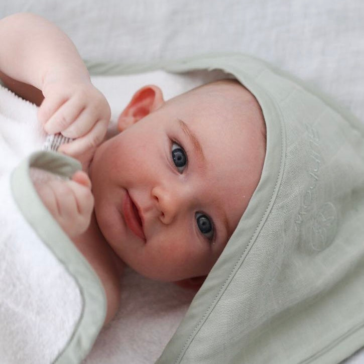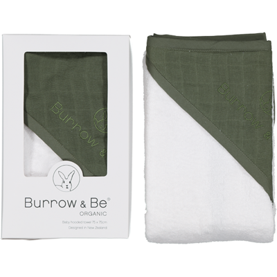 These gorgeous, Burrow & Be baby hooded towels are ethically made from 100% GOTS certified organic cotton. Each towel is made from beautiful soft terry towelling and the hood is detailed with a layer of coloured muslin and the Burrow and Be logo subtly embroidered.