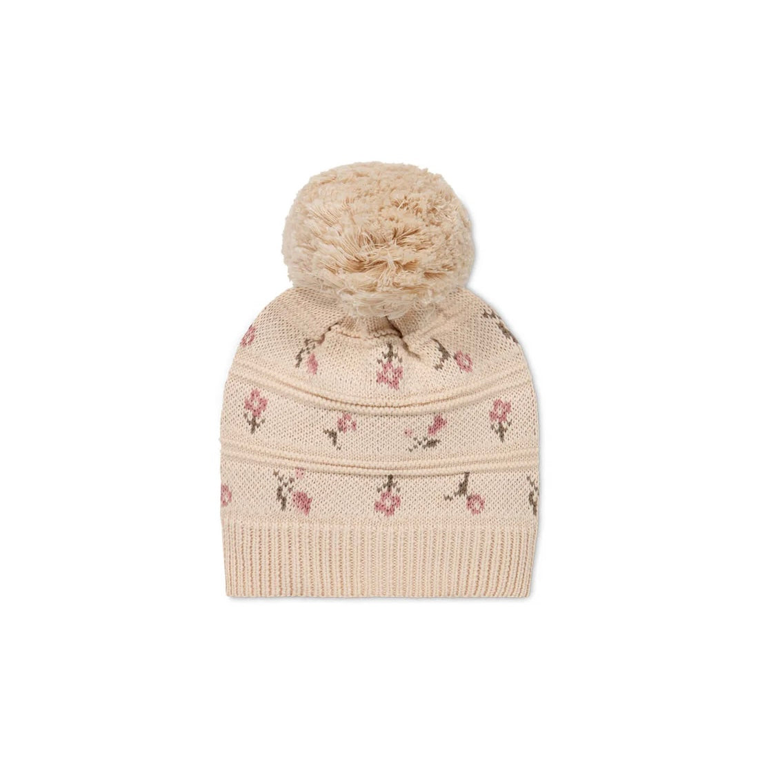This sweet style features floral patterning all around, plus a gorgeous fluffy pompom.