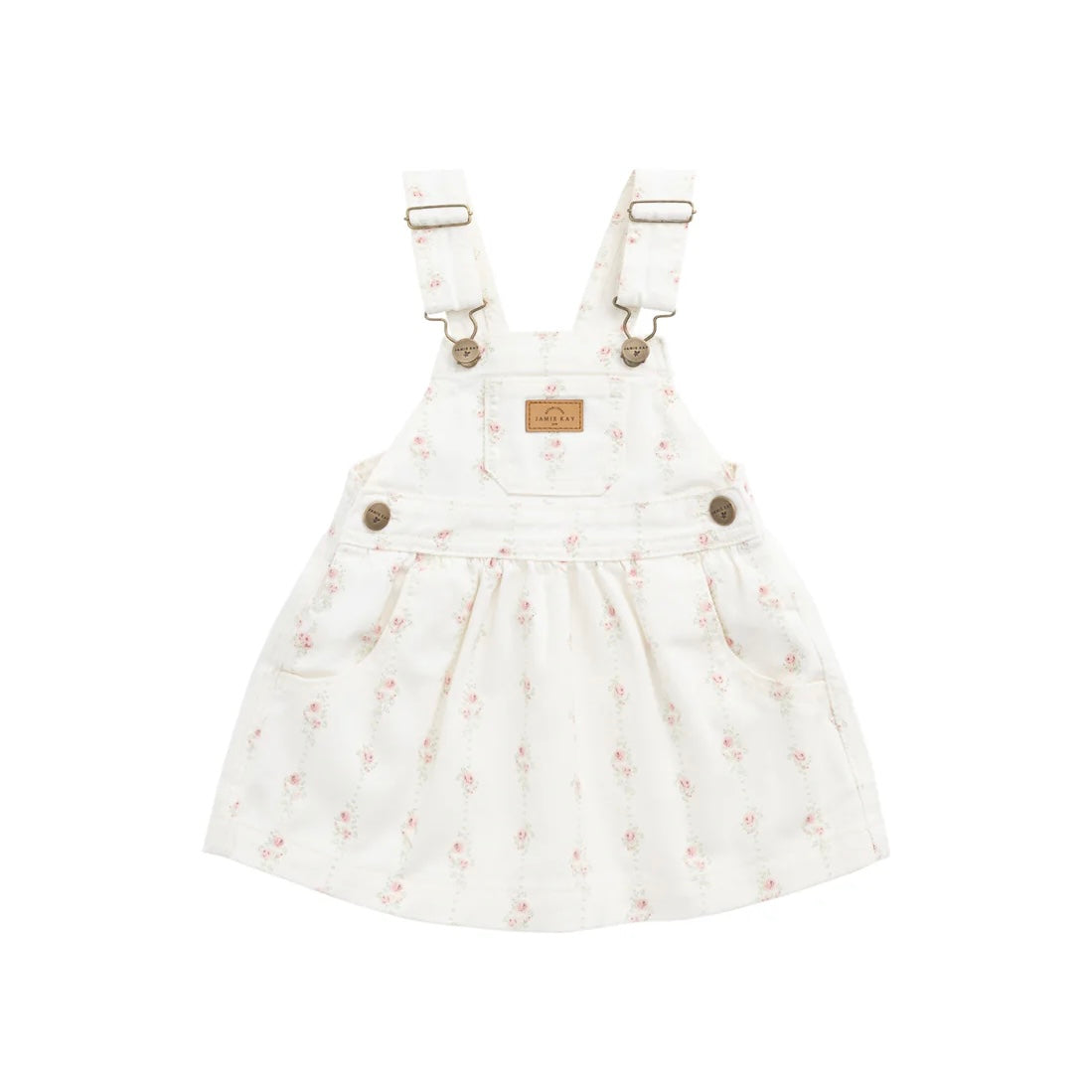 The Norah Overall Dress in Rose Trail is a sweet and practical piece for your little one’s wardrobe. Crafted with a delicate pink floral print on a creamy base, this overall-style dress features adjustable shoulder straps with metal buckles, a chest pocket with a branded patch, and two side pockets for tiny treasures.
