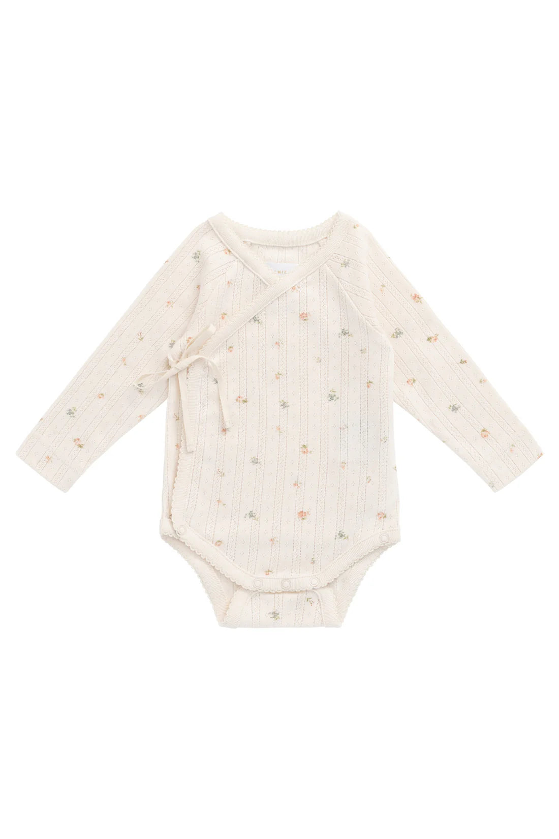 The Marina Bodysuit in Sweet Magnolia Simple is a beautifully designed essential for your little one. Featuring a long sleeve wrap-style silhouette, this bodysuit ties gently at the side and includes dome closures at the crotch for easy changing. Crafted from 100% Organic Cotton, it offers breathable comfort and a delicate pointelle knit for timeless charm.