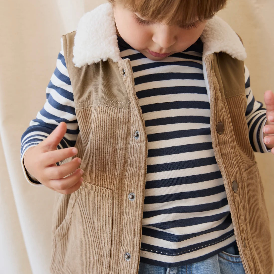 A soft and timeless essential for your little one, the Vinny Long Sleeve Top in Essential Stripe Charter/Cloud features a classic stripe pattern in neutral tones of charter and cloud. With a round neckline and long sleeves, this top is perfect for layering or wearing solo on cooler days.